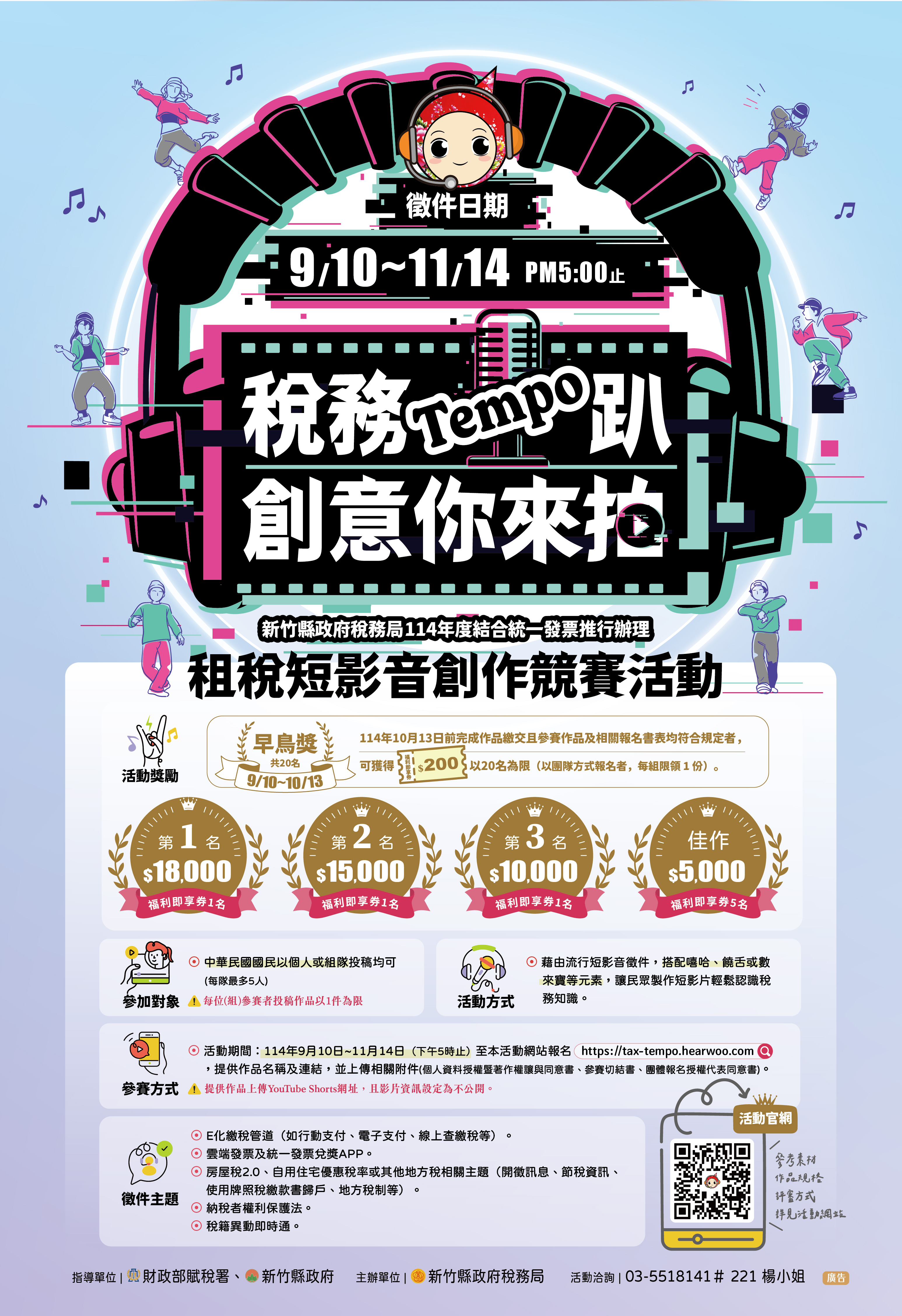 【競賽】 新竹縣政府稅務局-「稅務Tempo趴 創意你來拍」租稅短影音創作競賽【截止日期:114/11/14】