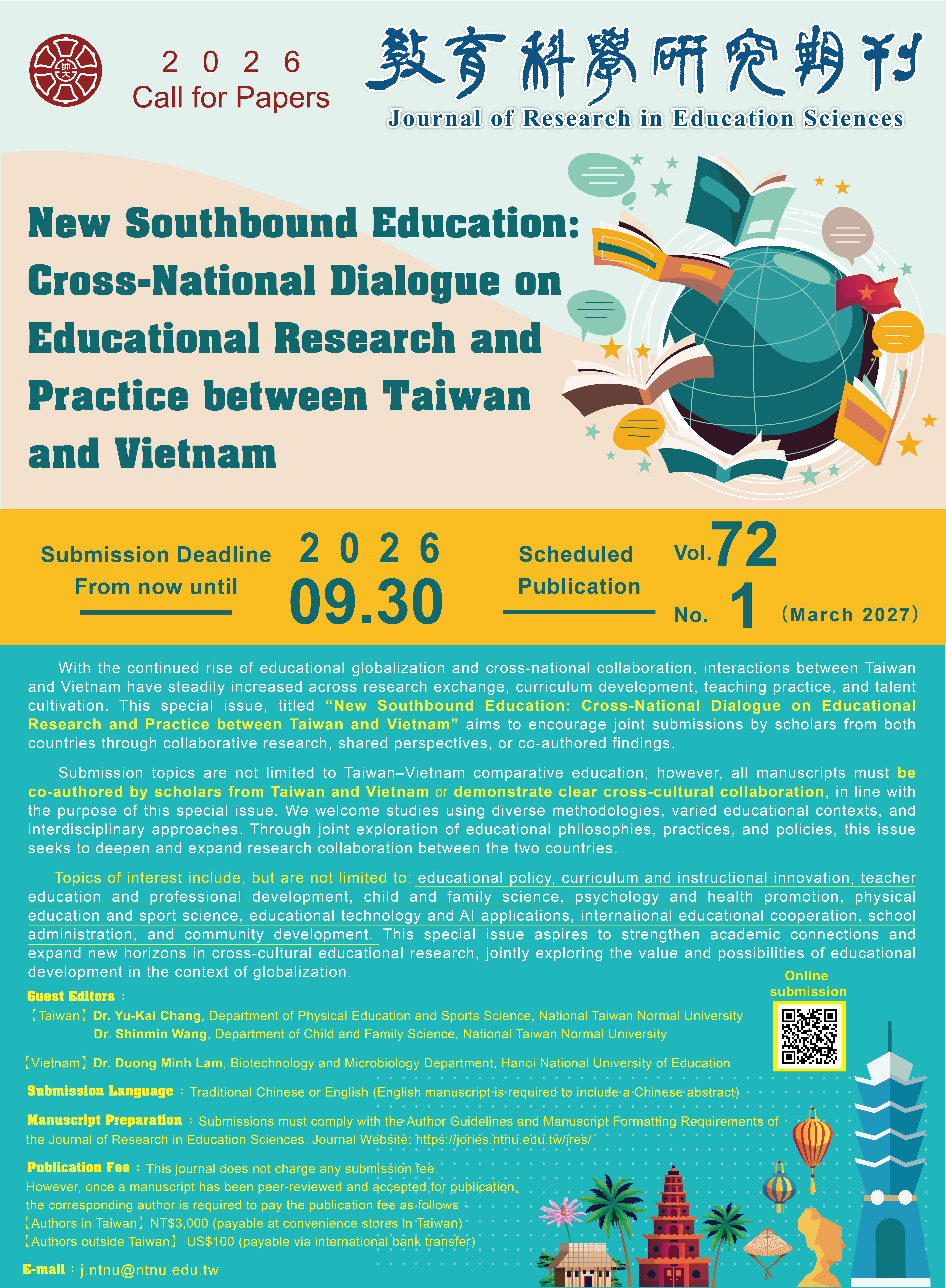 本校《教育科學研究期刊》專題徵稿主題「教育新南向:臺灣與越南的跨國教育研究與實踐對話」,敬請轉知貴校師生踴躍賜稿,以光篇幅,敬請查照。